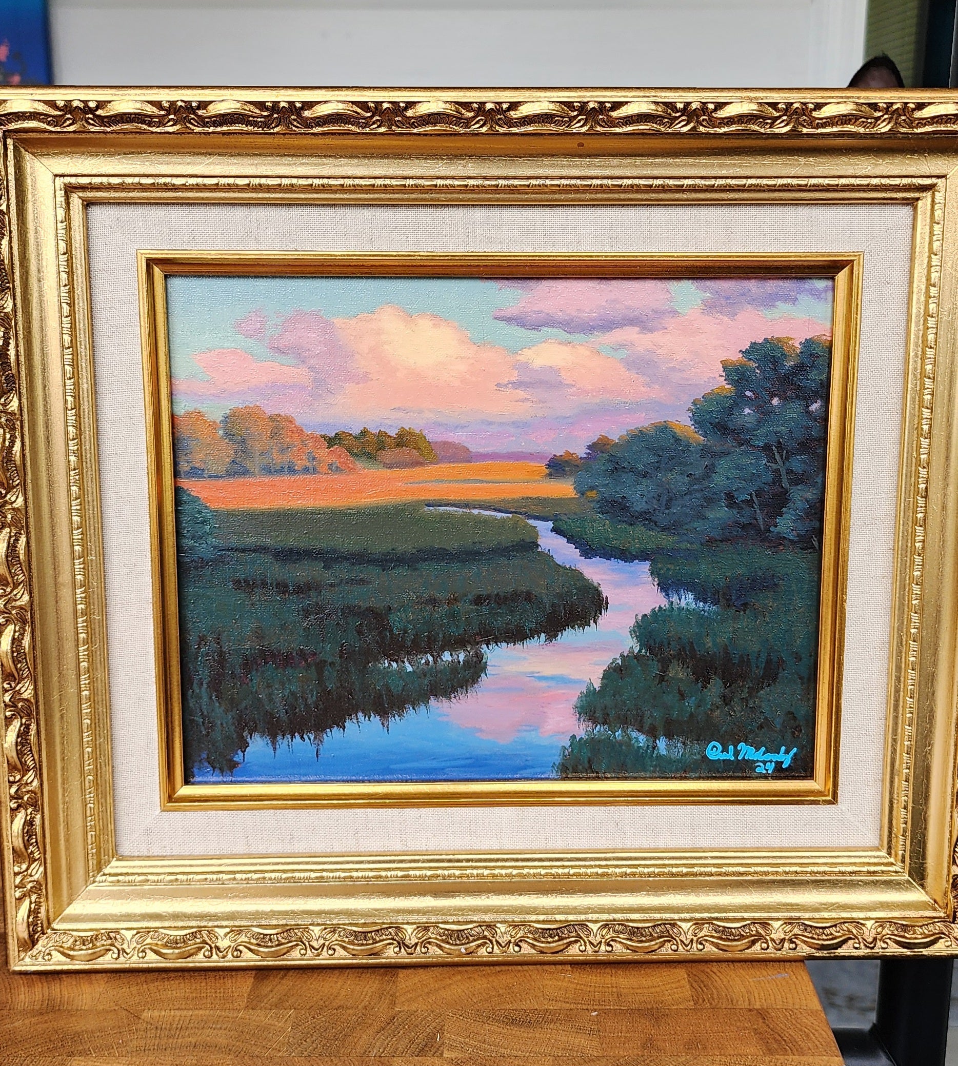 Capture the serene beauty of Charleston’s marshlands with this 8x10 oil painting titled "Reflection." Featuring a harmonious blend of blue and purple skies mirrored in tranquil waters, the artwork highlights lush green marsh grasses under a vast, calming sky. This sophisticated landscape piece brings a peaceful, natural elegance to any space, inviting quiet contemplation and a connection to the coastal environment.